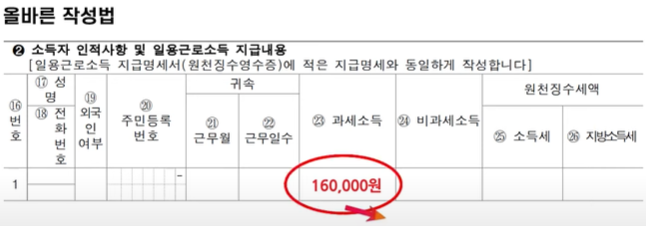 과세소득으로 10,000원, 비과세소득으로 150,000원으로 기재하는 것은 잘못된 작성법입니다.