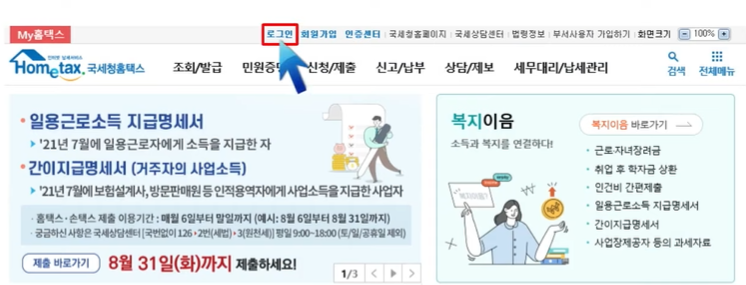 1. 홈택스 초기화면 상단 <로그인> 클릭후 로그인