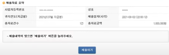 위에서 <소득자료 작성완료>를 누르면 아래와 같이 제출자료 요약 내역이 표시됩니다. 내용을 확인 후, <제출하기>를 누릅니다. 제출하기를 눌러줘야지만 제출이 완료되니 잊지 마시기 바랍니다.