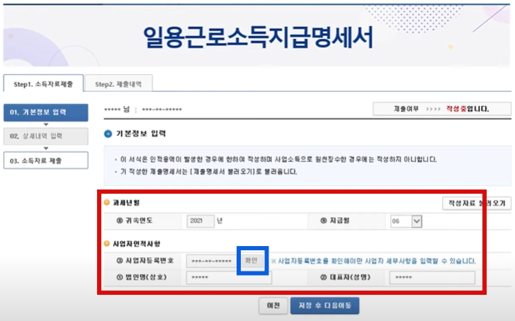 자동으로 입력된 과세년월, 사업자 인적사항을 확인해주세요. 만약 세무대리인으로 로그인한 경우, 수임한 사업자등록번호를 입력하고 <확인> 버튼을 클릭하면 사업자 인적사항이 자동 조회됩니다. 모든 항목을 확인 후 <저장 후 다음이동> 버튼을 클릭해주세요.