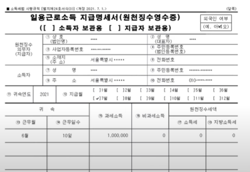 7월10일 1일간 고용 / 일당 16만 원 / 야간근로수당(비과세소득) 없음