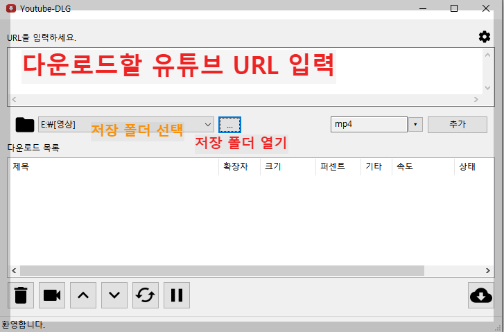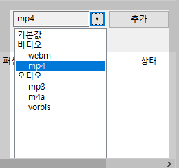 다운로드할 유튜브 URL을 위 창에 입력 후, 저장할 폴더를 선택하고, 아래와 같이 어떤 형식으로 저장할지 선택해줍니다. 그리고 우측의 <추가> 버튼을 클릭하면 다운로드 목록에 추가됩니다.