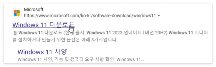 2. 검색 결과에서 마이크로소프트의 공식 'Windows 11 다운로드' 페이지로 접속합니다.