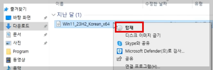 1. 파일 탐색기를 열어 방금 다운로드한 윈도우 11 ISO 파일을 찾습니다.