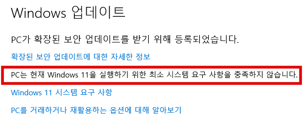 ▼아래와 같이 표시되면 윈도우11로 업그레이드 불가한 사양