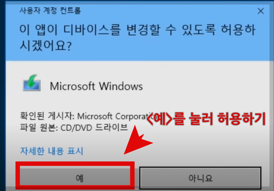 5. 잠시 후 '사용자 계정 컨트롤' 창이 나타나면 '예'를 눌러 허용합니다.