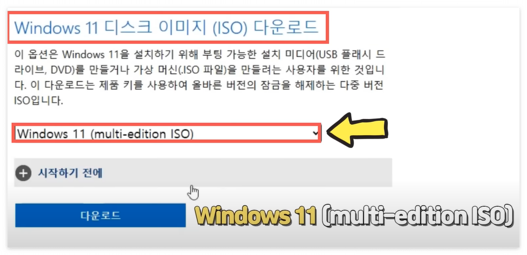 4. '다운로드 선택' 드롭다운 메뉴에서 'Windows 11 (multi-edition ISO)'를 선택하고 '다운로드' 버튼을 클릭합니다.