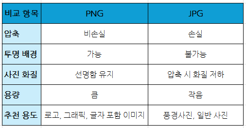 → 그래픽엔 PNG, 사진엔 JPG가 정석이에요.