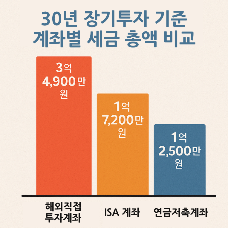 이것이 장기적으로 어떻게 장점이 될까요? 투자 기간이 20년을 훌쩍 넘어가면, 원금보다 투자 수익이 훨씬 더 커집니다. 이때 연금저축의 압도적으로 낮은 세율(3.3%~5.5%)이 빛을 발합니다. 30년 투자 시뮬레이션을 보면, 연금저축의 세금은 1억 2,500만 원으로 ISA 계좌(1억 7,200만 원)나 해외 직접투자 계좌(3억 4,900만 원)보다 월등히 적습니다. 과세 대상은 크지만, 낮은 세율 덕분에 최종 세액은 가장 적어지는 역설적인 결과가 나타나는 것입니다.