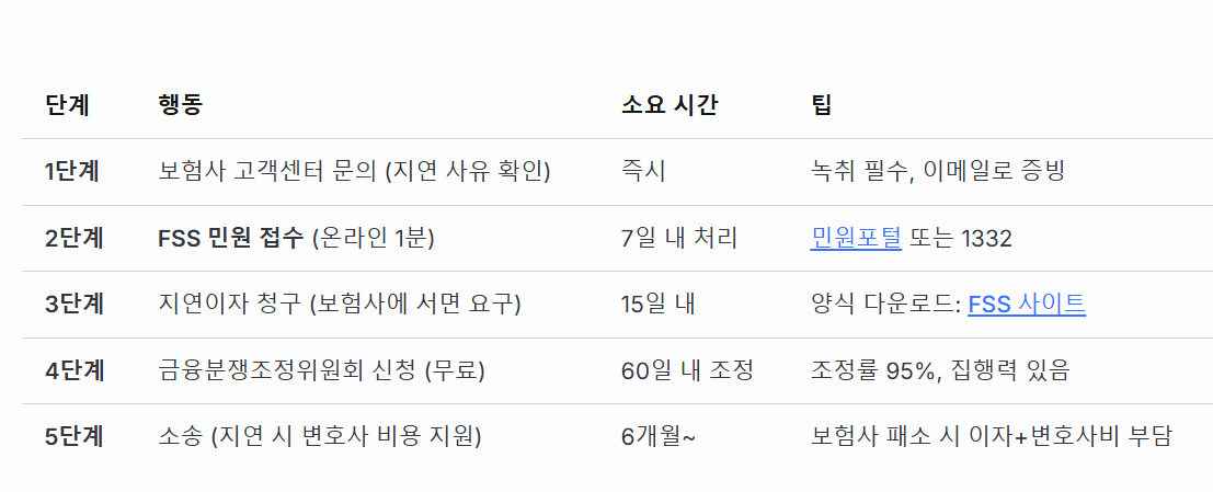 - 면책 사유: 보험사 과실 없으면(예: 사기 입증) 지연이자 면제