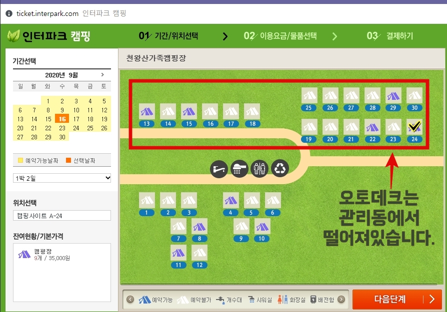 주의: 현재 사회적 거리두기로 데크 30면의 반인 16면정도만 예약이 가능하다고 합니다. (오토 9면/일반 7면)