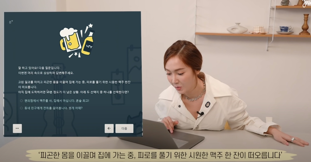 질문2) 피곤한 몸을 이끌며 집에 가는 중, 피로를 풀기 위한 시원한 맥주 한 잔이 떠오릅니다. 집에 도착하려면 아직 30분 정도가 남은 상황, 아래 두 가지 중 선택한다면?