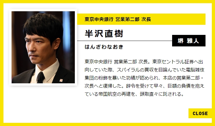 도쿄센트럴증권으로 좌천된 한자와 나오키(사카이 마사토)는 전뇌잡기집단(사이버 아크로바틱?)라는 IT기업으로부터 검색엔진기업인 <스파이럴>을 인수하고 싶으니, 그 일을 진행해달라는 제안을 받습니다. 1500억 엔이라는 대형 건이라 고민인 많은 한자와. 부하직원인 모리야마에게 스파이럴에 내분이 일어났다는 사실을 듣게 됩니다.