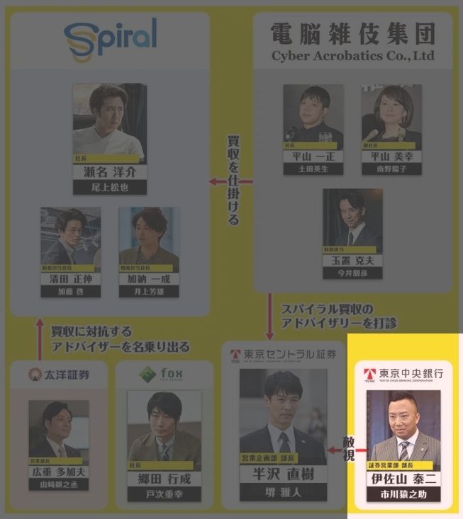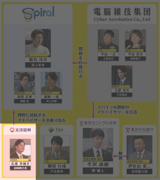 스파이럴과 과거 인연이 있었던 증권사로 적대적M&A가 시작되자 매수 당하는 것을 저지하기 위해 세나 대표에게 신주발행에 대한 안을 제안합니다. 영업부장인 히로시게는 "수수료는 받을 수 있는 거죠?" 라는 굴욕적 멘트를 남깁니다. 웃음 포인트.