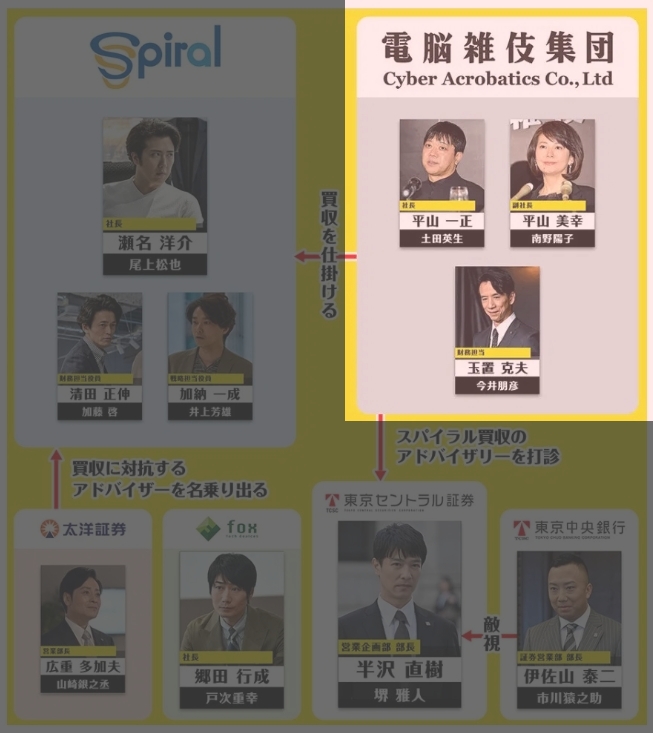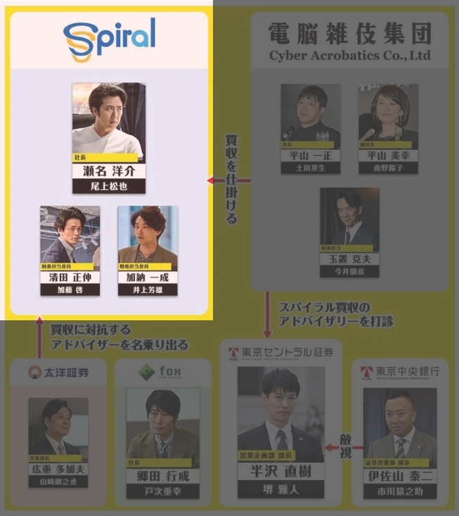 한자와가 다니는 도쿄센트럴증권의 시스템을 개발한 곳. 적대적 M&A의 희생양이 되지 않도록 이번에는 센트럴증권과 어드바이저 계약을 맺게 됩니다. 대표는 세나 요스케. 주요 임원 두 명과 뜻이 맞지 않아 부딪치게 되고, 결국 그들은 독립을 하게 됩니다. 그러나 독립한 회사의 경영이 어려워지자, 자신들이 가진 스파이럴의 어마어마한 지분을 다음에 나올 전뇌잡기집단이라는 IT기업에 넘기면서 세나의 경영권이 넘어갈 위기에 빠집니다.