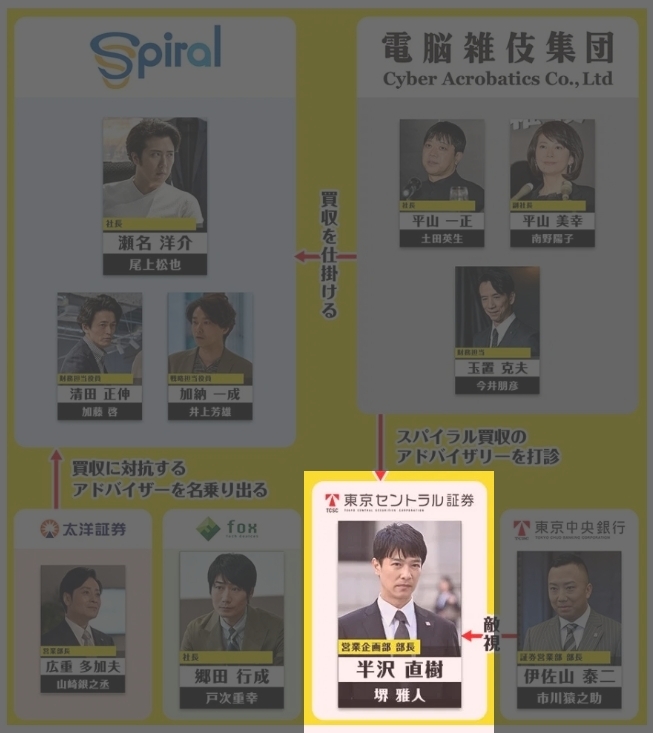 원래 도쿄센트럴증권의 모리타 마사히로가 담당하던 대규모 IT기업. 사장인 히라야마가 '스파이럴'을 인수하고 싶다는 이야기를 꺼내면서 드라마 한자와나오키가 시작됩니다. 인수금액은 1500억 엔 이상. 도쿄센트럴증권으로서는 규모가 큰 계약으로 꼭 성공하고 싶은 계약이기도 합니다. 하지만 원래 한자와가 다니던 도쿄중앙은행(센트럴증권의 모회사)가 중간에 가로채가면서 계약이 파기되죠. 하지만 당하고만 있을 한자와가 아닙니다. 반대로 이 집단이 스파이럴을 인수하지 못 하게 저지하려 애씁니다. 이것은 당한 것을 배로 갚기 위해서만은 아닙니다. 스파이럴이 적대적 M&A 당하는 것을 보고만 있을 수 없기 때문이었죠. 모리타와 세나가 친구 관계인 것도 있고요.