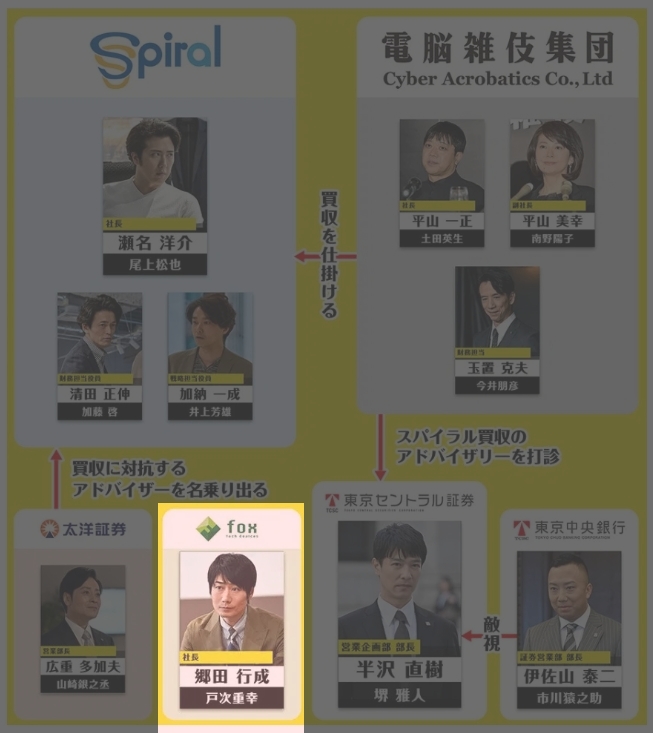 스파이럴과 과거 인연이 있었던 증권사로 적대적M&A가 시작되자 매수 당하는 것을 저지하기 위해 세나 대표에게 신주발행에 대한 안을 제안합니다. 영업부장인 히로시게는 "수수료는 받을 수 있는 거죠?" 라는 굴욕적 멘트를 남깁니다. 웃음 포인트.