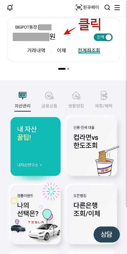 1. 이번에는 누군가에게 돈을 송금하고 확인을 해주고 싶을 때 쓰시는 방법입니다. 로그인 후 잔액 표시된 곳을 누릅니다.