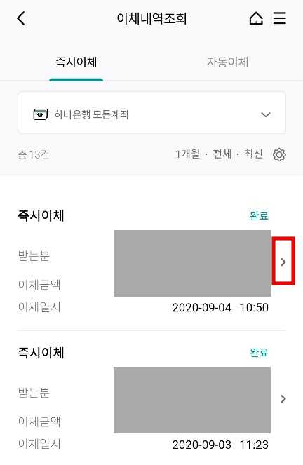 4. 이체내역조회에는 이체 내역들이 최근 건부터 표시가 됩니다. 원하는 이체내역에서 우측 화살표 선택.