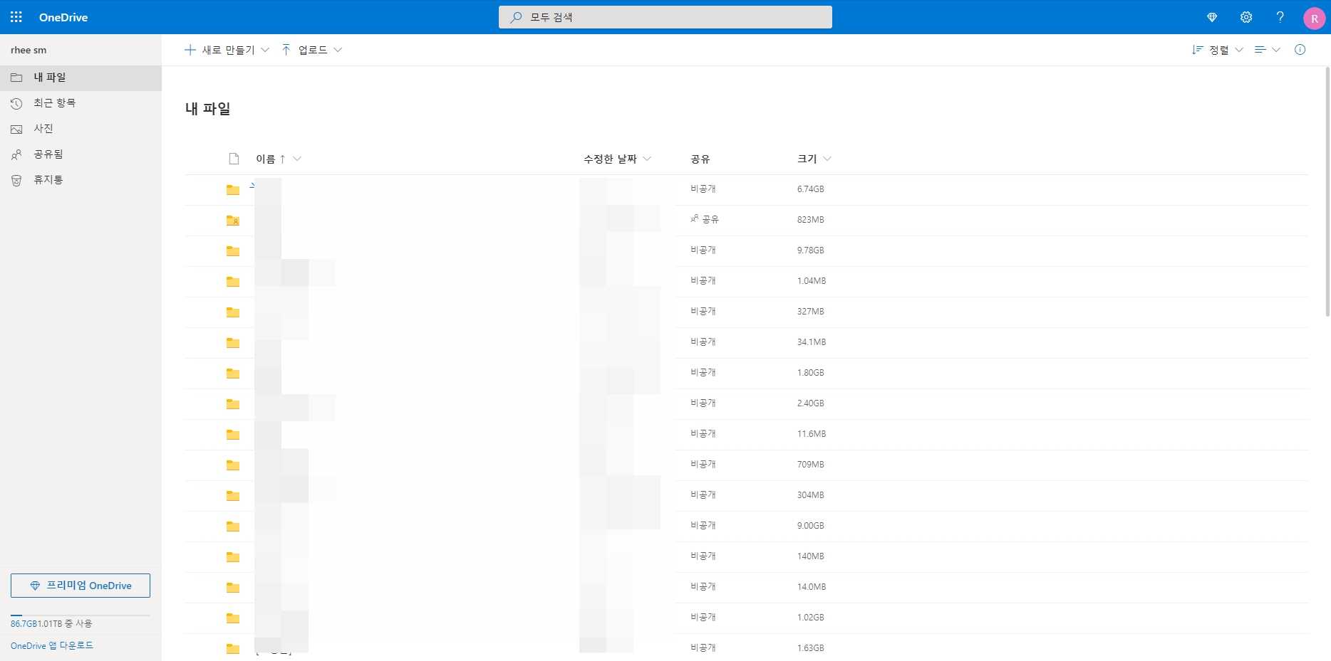 현재 폴더가 생성되어 있는 것은 제가 기존에 원드라이브를 동기화하여 사용하고 있었기 때문이고, 만약 처음 사용하신 분들은 폴더가 없을 거예요. 원드라이브는 파일별로 업로드도 가능하고 폴더 통채로 업로드도 가능합니다.