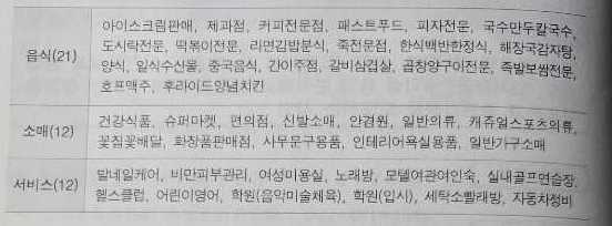 7) (업종추천) 전 업종에 대해 7개 광역시별 성공점포의 성공요인, 소비패턴, 생활패턴 등을 분석하여 입지특성별 성공가능성이 높은 업종 추천