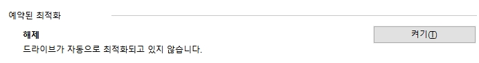 만약, HDD로 되어 있다면 <설정 변경> 혹은 <켜기> 버튼 위의 <최적화> 버튼을 눌러 디스크조각모음을 실행해보세요.