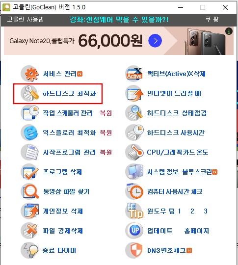 1) 고클린이 설치되었다면 이제 하드디스크 최적화를 클릭하세요.