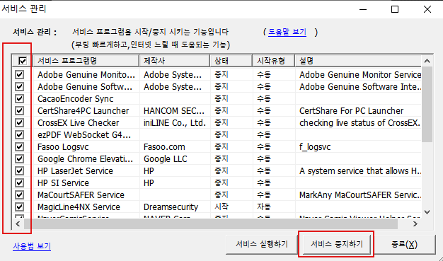PC가 켜져있는동안 계속 돌아가는 서비스의 리스트가 나타납니다. 이것도 많으면 많을수록 컴퓨터는 느려집니다. 일단 전부 체크한 후 서비스 중지하기를 눌러주세요. 어차피 필요하다면 다시 켜지니까요.