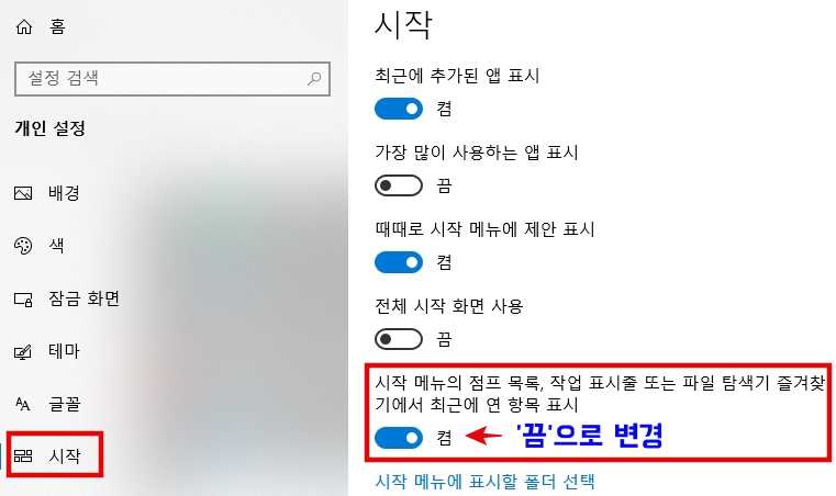 ▶ 시작 > 설정 > 개인 설정> (좌측 메뉴 중) 시작 > 시작 메뉴의 점프 목록, 작업표시줄 또는 파일 탐색기 즐겨찾기에서 최근에 연 항목 표시 > 켬을 끔으로