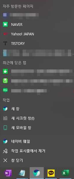 ▶ 또한 2번 이미지에서 보이듯 작업표시줄에도 흔적이 남습니다. 작업표시줄에 마우스를 대고 우클릭을 하면 최근에 사용한 파일, 동영상 등의 목록이 좌르륵 나옵니다.